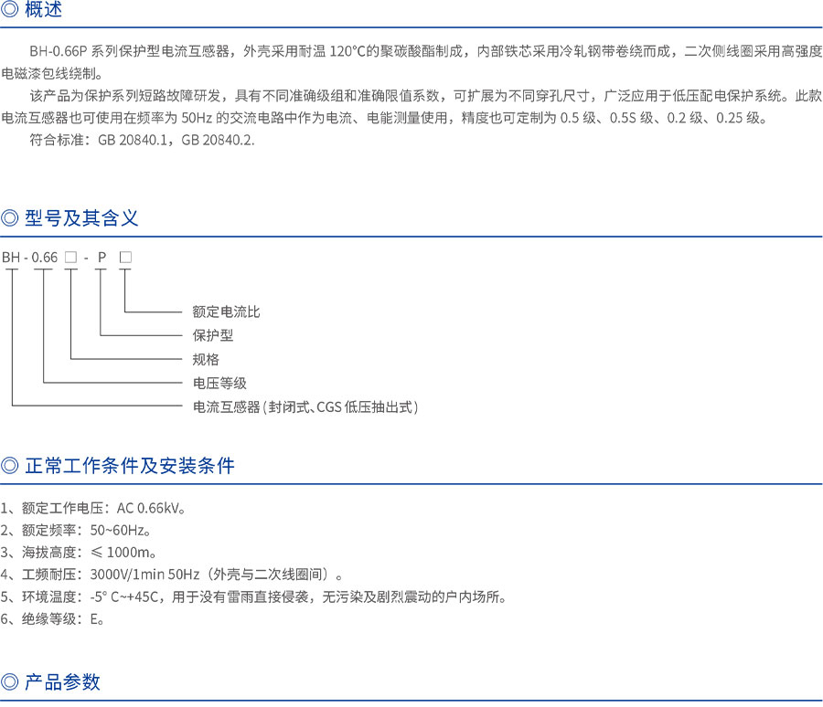 BH-0.66P系列保護型電流互感器,外売采用耐溫120C的聚碳酸酯制成,內部鐵芯采用冷軋鋼帶卷繞而成,二次側線圈采用高強度電磁漆包線繞制。產品詳情